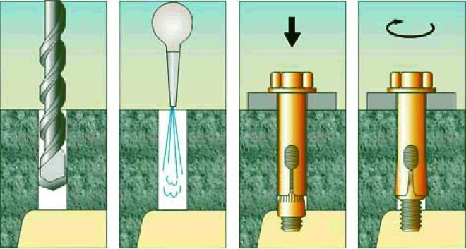 Установка клинового анкера осуществляется в сжатые сроки. Для проведения работ достаточно типового инструмента. Монтаж выполняется в несколько этапов.