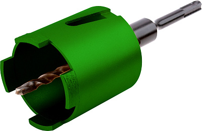 Буровые коронки используются в качестве насадок для перфораторов. Они необходимы для сверления глухих отверстий большого диаметра (50–80 мм) под выключатели, подрозетники, распределительные коробки и другие электроустановочные изделия. Рабочая кромка коронки по бетону выполняется в форме цилиндрической чаши с закаленными твердосплавными режущими зубьями или посыпкой из алмазной крошки. На противоположной стороне насадки расположен мощный хвостовик для фиксации оснастки в патроне перфоратора. Центрирующее сверло обеспечивает высокую точность бурения бетона, кирпича и камня.